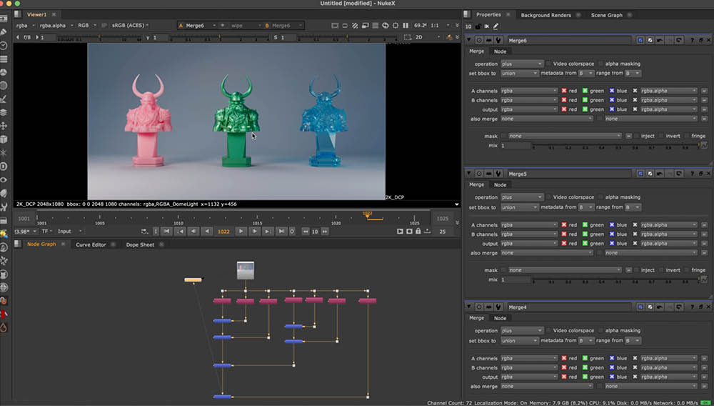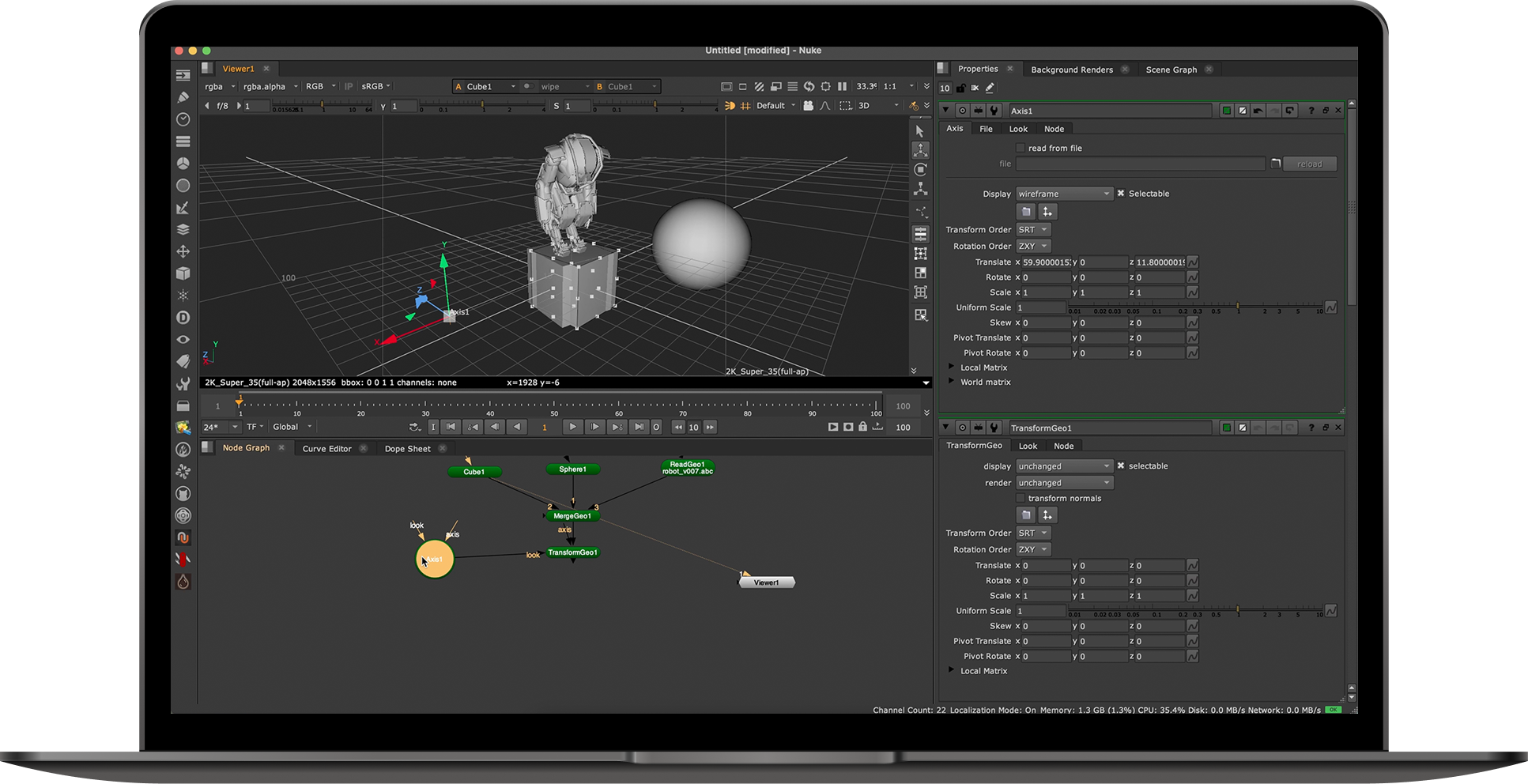 Nuke dispone de un entorno 3D completo, lo que permite componer imágenes reales con contenido CGI de forma integrada y precisa. Gracias a esta funcionalidad, es posible trabajar directamente en un espacio tridimensional dentro del propio software, sin necesidad de recurrir a herramientas externas.
