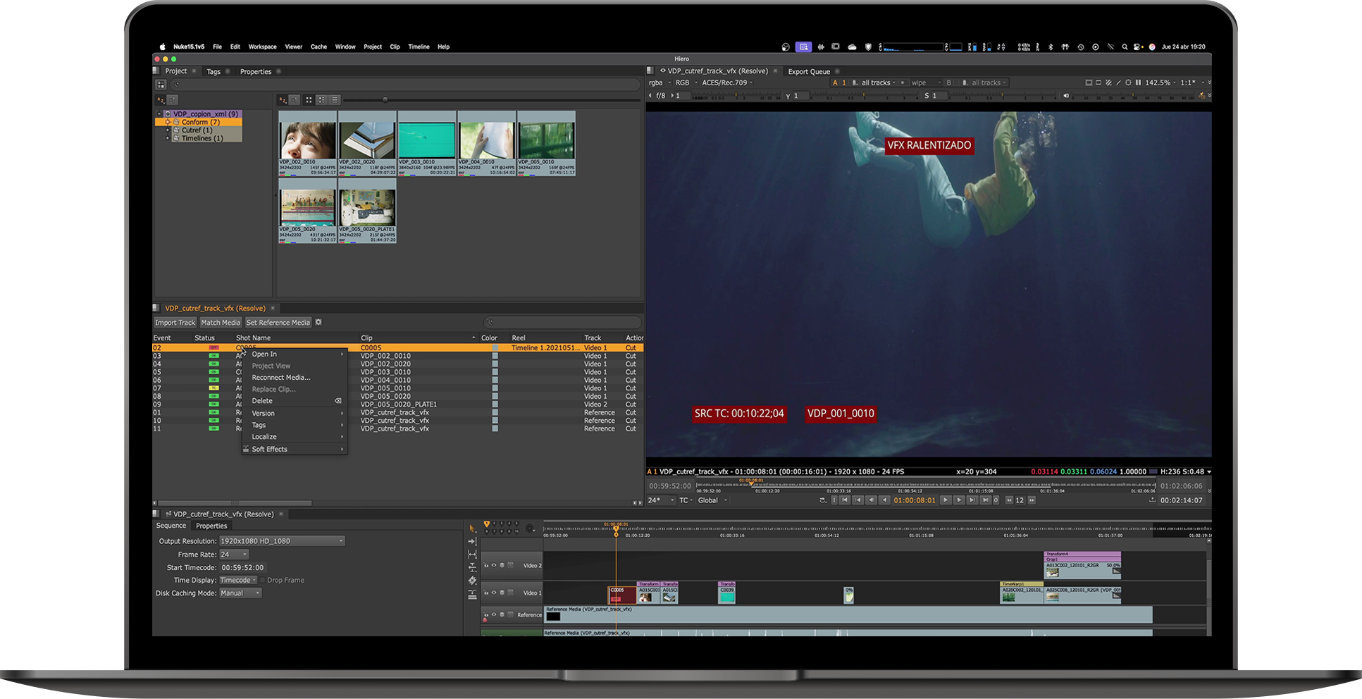 El máster se desarrolla con The Foundry Hiero, una herramienta que encaja perfectamente en el flujo de trabajo de VFX, permitiendo preparar planos con su duración, efectos de retime y transformaciones según indicaciones de montaje. Además, genera automáticamente los scripts para Nuke, eliminando errores y dejando todo listo para que la persona encargada de la composición se centre únicamente en sus tareas, sin preocuparse por aspectos técnicos como la nomenclatura, el espacio de color, el formato o la configuración de render.