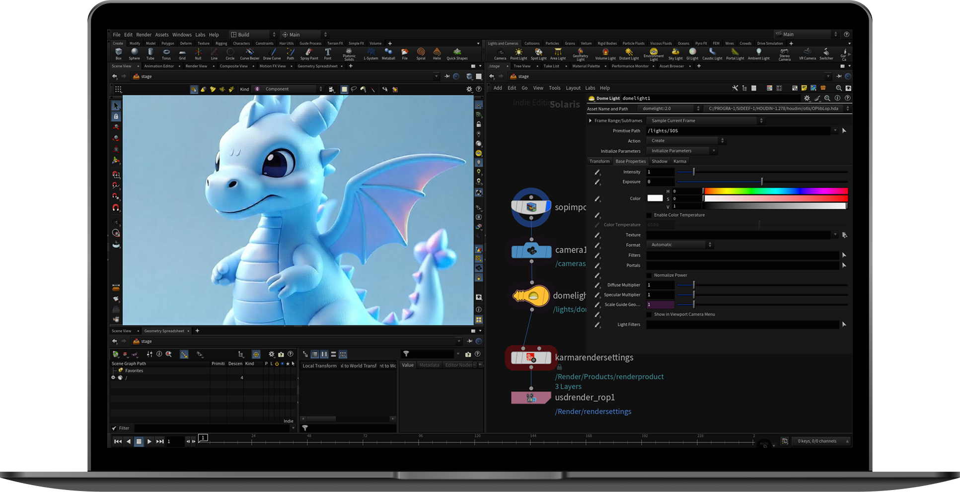 Aprenderás a trabajar con Solaris, el sistema de iluminación y gestión de escenas de Houdini basado en USD, diseñado para construir entornos complejos de forma eficiente y profesional. A lo largo del máster, te introducirás en los fundamentos de la organización de escenas, el uso del formato USD (Universal Scene Description) y las técnicas avanzadas de renderizado con Karma.